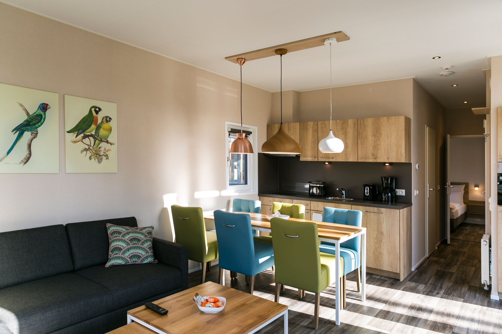 Die Nature Homes liegen inmitten einer Parkähnlichen Landschaft zwischen Kiefern und Birken. Sie sind ca. 45m² groß und können für vier bis sechs Personen gebucht werden. Der Camp-Shop mit kleinem Supermarkt (frische Brötchen) und Biergarten, sowie Kinderspielplätze befinden in der Nähe.